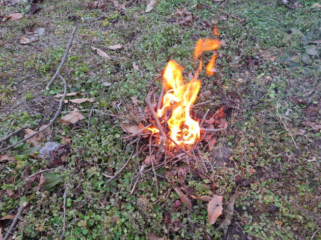 畑でも夕暮れになると肌寒さがこたえます。そんな時は小枝集めてブチ焚き火。枯れた栗の木があり、薪には事欠きません。小枝でも火持ちがいいので意外に長持ち。足先や手指を温めます。煙の香りも良く心も温まり良い感じ。