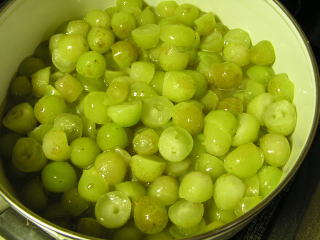 材料・・・・・葡萄1キロ。砂糖250g。レモン4分の1 @葡萄は、煮る前に包丁で実を二つに割り種を抜いて おきます。又、皮はむきません。皮はあったほうが断然 ウマイっと園主は思うのであります。また巨峰などの黒 系葡萄は、ポリフェノールの摂取も考え、是非皮付きで チャレンジしてみてください。 |