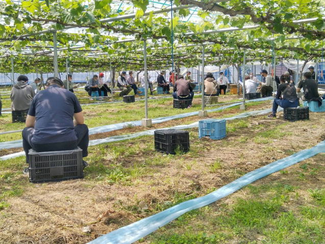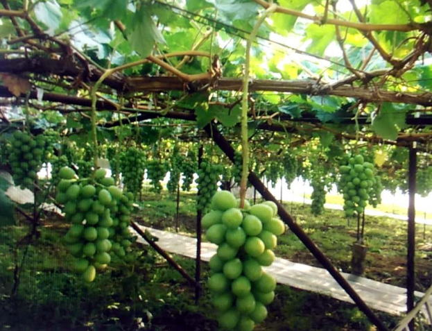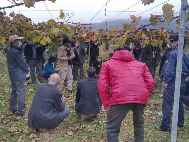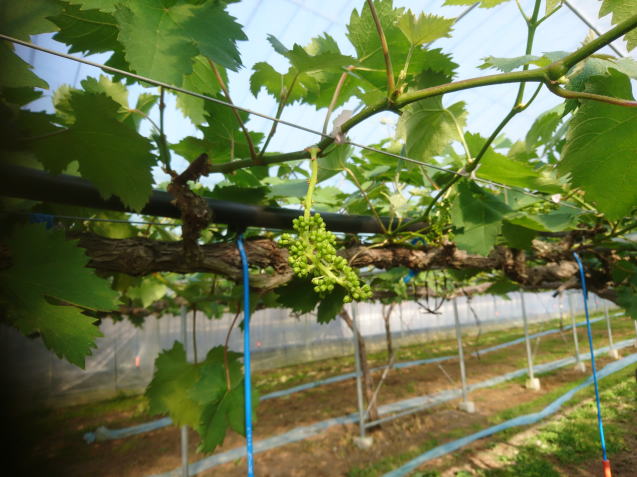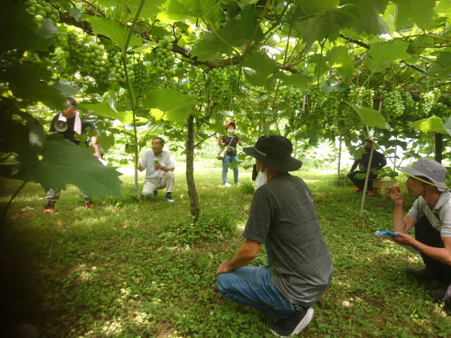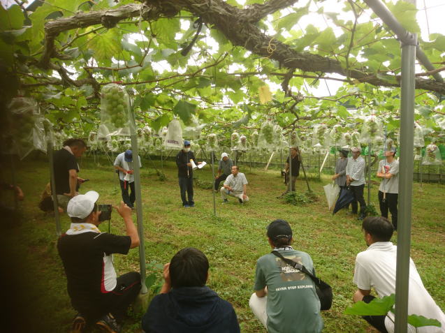 その後、中野市の阿部理事長のシャインマスカット園を視察。1ヶ月後に収穫とのこと。